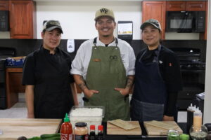 As rice cooled and seaweed sheets were laid out, Say Wah and Beh Mah demonstrated their rolling techniques, transforming simple ingredients into beautifully balanced rolls. Encouraged by their mentors, students soon took their own turns behind the cutting boards, crafting veggie, California, and spicy tuna rolls topped with vibrant accents like vegan sriracha mayo, hoisin, eel sauce, sesame seeds, and wasabi tobiko.
