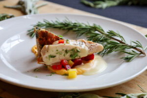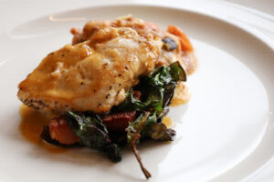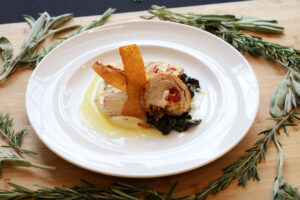 - Entrée: Herb-grilled chicken breast and roulade stuffed with sundried tomato, sage, yellow pepper, lemon zest, cream cheese; Swiss chard, bacon, onion, Yukon purée, crispy plantains