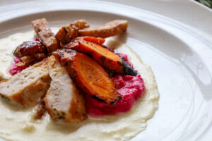 - Entrée: Pan-seared chicken breast, pulled chicken thigh, charred carrot, pomme frites, fig jam, parsnip and beet purée, white wine cream reduction