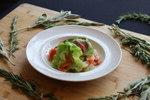 - Salad: Beetroot carpaccio with orange slices, heirloom grape tomato, frisée, red oak, Bartlett pear, carrot ribbons, honey-orange vinaigrette