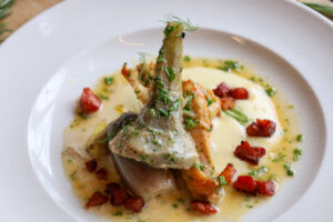 - Entrée: Sautéed chicken breast and herb-roasted thigh, pancetta-braised endive, grilled artichoke, goat cheese pomme purée, heirloom tomato beurre fondue