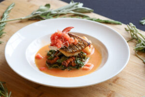 - Fish: Pan-seared striped bass, poached lobster tail, sun-dried tomato beurre blanc, roasted pancetta lardons, sauteed swiss chard and heirloom tomato