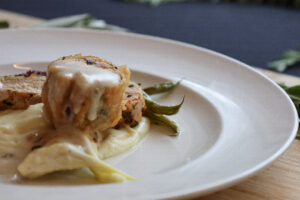 - Entrée: Pan-seared chicken breast and goat cheese-spinach-filled roasted roulade, red beets, sweet potato mash, herb chicken velouté