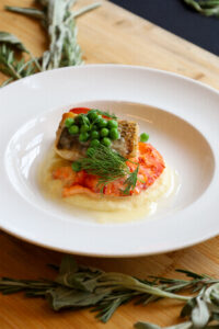 - Fish: Sauté of striped bass, poached lobster, parsnip purée, pomme frites, peas, herbs, and white wine sauce