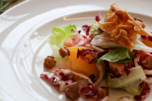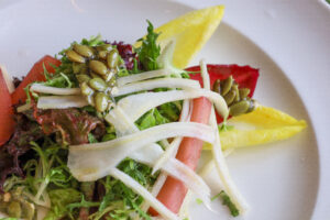 - Salad: Lollo rosso, endive, frisée with pickled fennel and celeriac, red wine-poached D’Anjou pear, candied pepitas, champagne-mustard vinaigrette