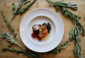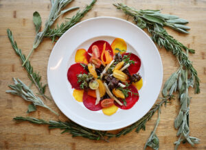 - Salad: Red and gold beet salad with maple beet yogurt, frisée, pear, red oak, citrus vinaigrette