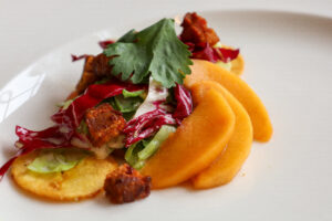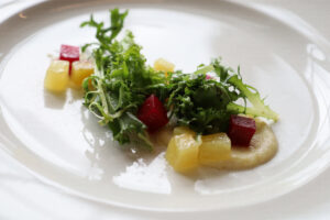 - Salad: Beetroot carpaccio with orange slices, heirloom grape tomato, frisée, red oak, Bartlett pear, carrot ribbons, honey-orange vinaigrette