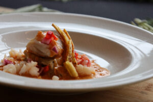 - Entrée: Pan-seared chicken with Creole butter sauce, andouille chicken gumbo on whipped Yukon potato, sautéed Swiss chard