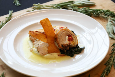 - Entrée: Herb-grilled chicken breast and roulade stuffed with sundried tomato, sage, yellow pepper, lemon zest, cream cheese; Swiss chard, bacon, onion, Yukon purée, crispy plantains
