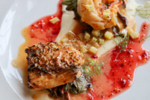 - Fish: Bacon-wrapped roasted trout stuffed with Asian pears, butter-poached lobster, Swiss chard, roasted beets, lemon butter caper sauce
